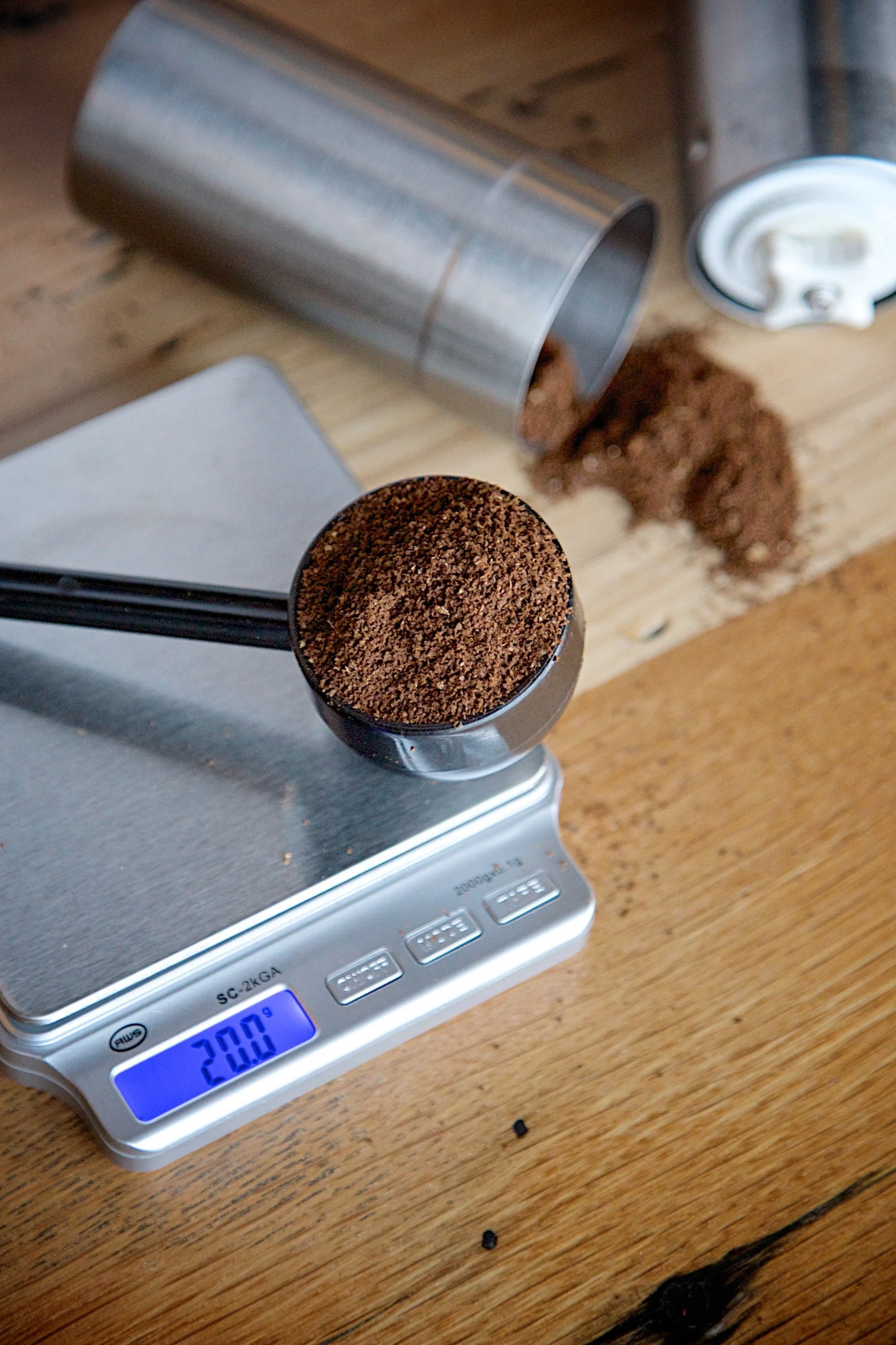 Add 20g of coffee to the Aeropress. The coffee should be ground slightly finer than medium coarseness.